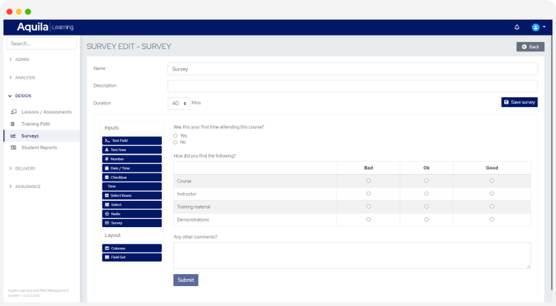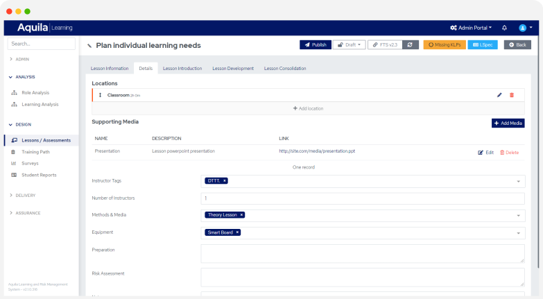 ALaRMS™ brings an incredibly intuitive and speedy method of course design to your finger tips. Linking training objectives back to the analysis phase for audit and reporting purposes, ALaRMS™ allows you to design training and assessments that really meet your requirements.